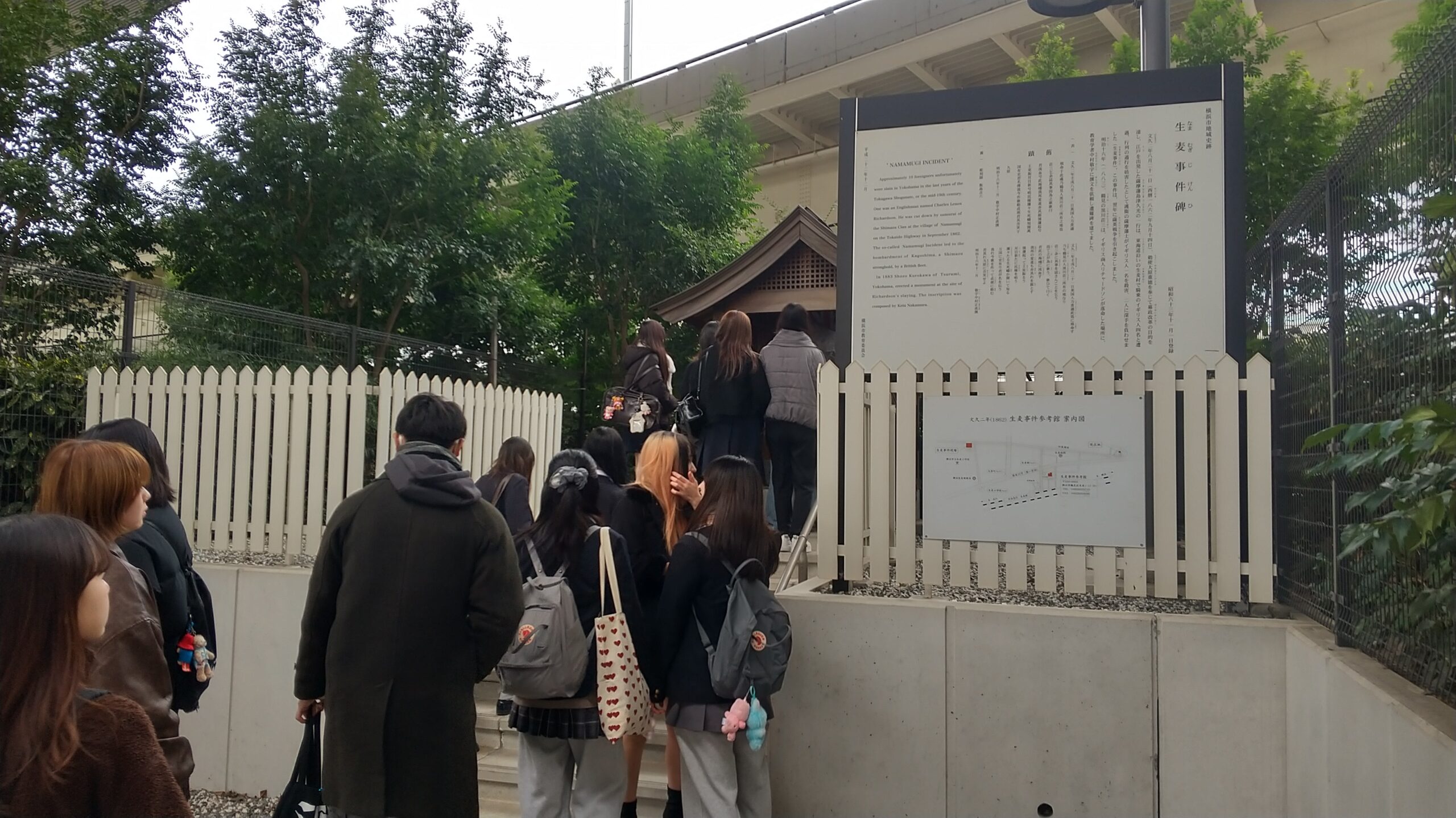 特別授業「最後の生麦」では、学校の所在地である生麦・岸谷地域の散策を行いました。3年間通った学校のすぐそばにあるものの行ったことがない生徒が多い生麦事件発生現場や生麦事件碑、機銃掃射の弾痕が今も残されているJR国道駅などを散策し、キリンビール横浜工場を見学しました。