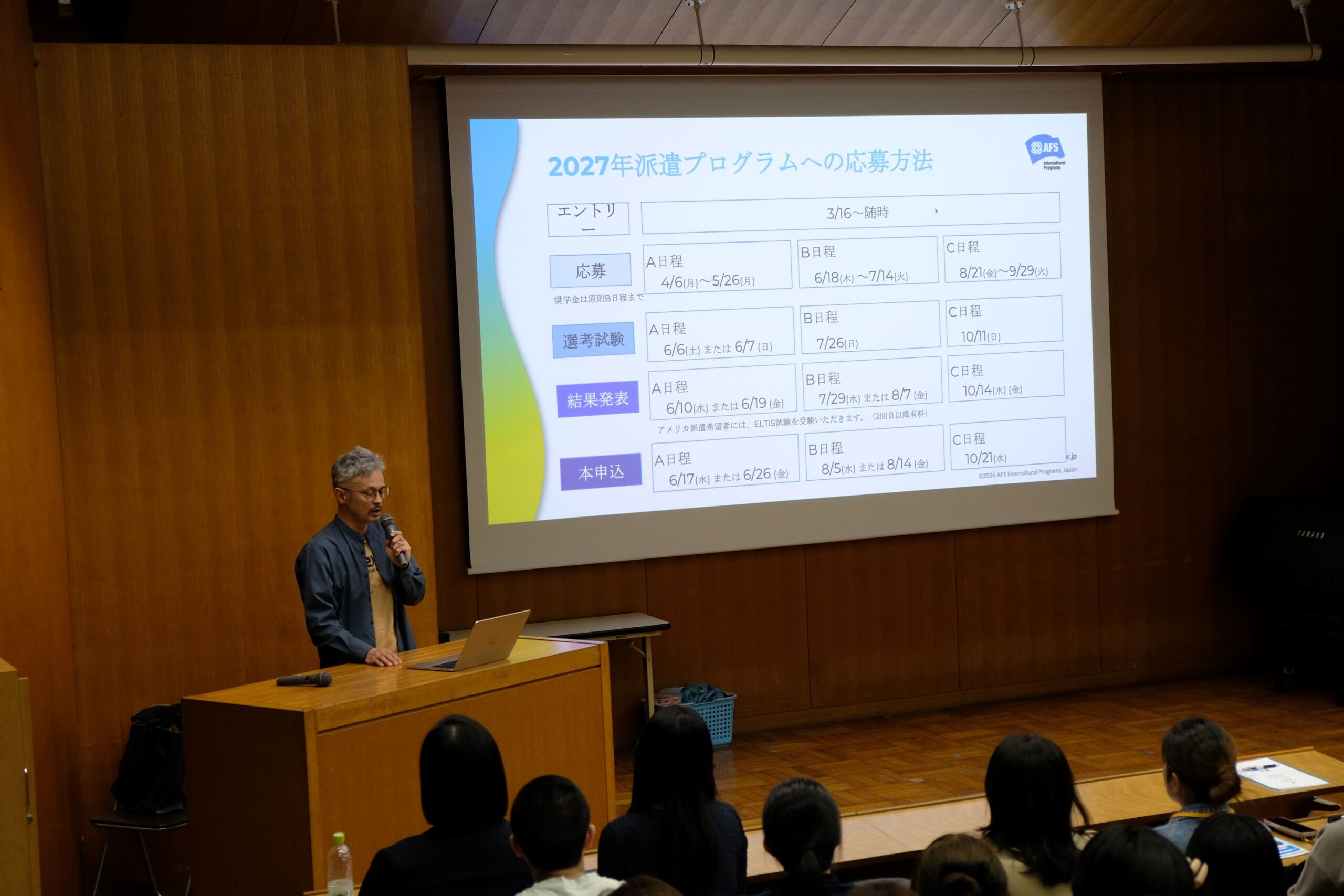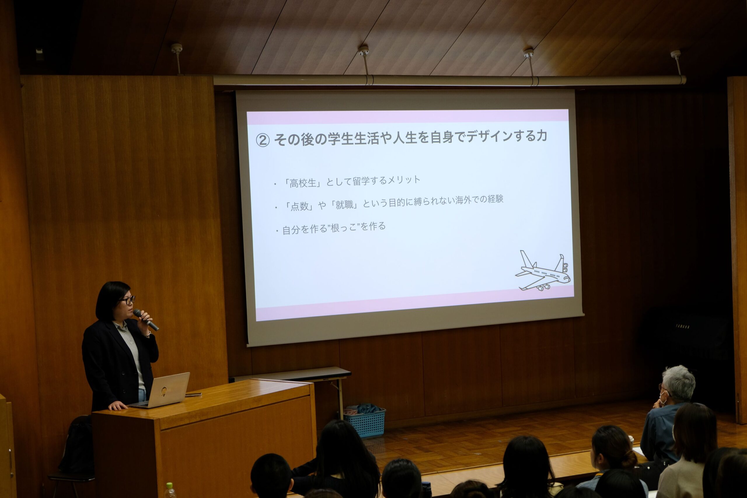 本説明会では、本校における留学の基本的な説明から始まり、公益財団法人AFS日本協会様による講演、留学経験者による体験談などさまざまな情報をお伝えしました。